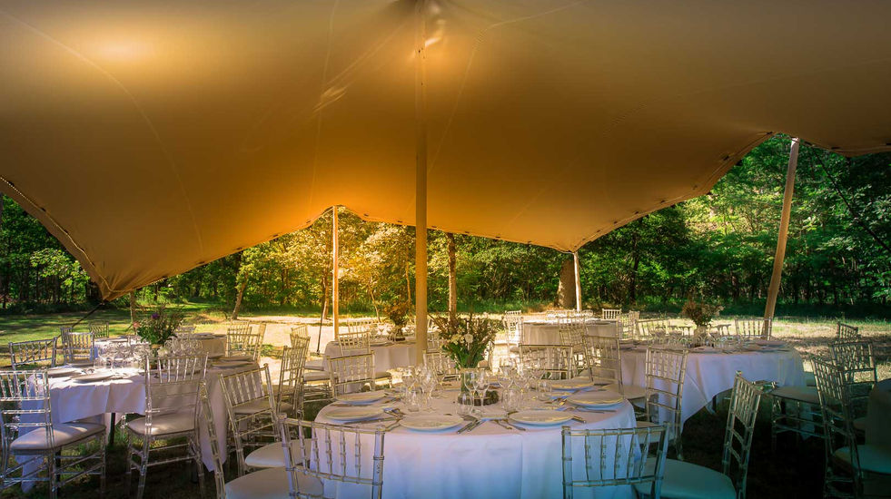 Following the outdoor theme, your wedding breakfast will be held in a stretch tent which can comfortably seat 220 guests. Provided and installed by the venue, this is fully equipped with tables, chairs, lighting, sound equipment, video projector and white screen.